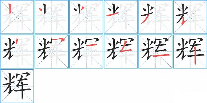 辉是左右结构,辉的部首是“车”,部外笔画8画,总笔画12画,辉的笔画顺序是“竖、点、撇、横、撇、竖提、点、横撇/横钩、横、撇折、横、竖”。看看“辉”字什么意思 >>