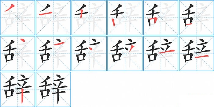 辞是左右结构,辞的部首是“辛”,部外笔画6画,总笔画13画,辞的笔画顺序是“撇、横、竖、竖、横折、横、点、横、点、撇、横、横、竖”。看看“辞”字什么意思 >>