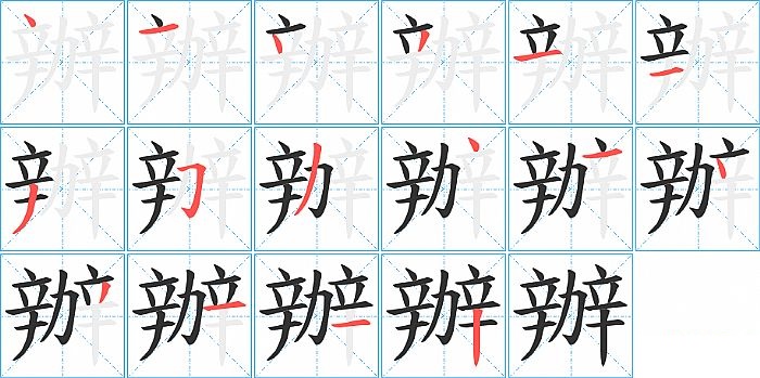 辦是左中右结构,辦的部首是“辛”,部外笔画9画,总笔画16画,辦的笔画顺序是“点、横、点、撇、横、横、撇、横折钩、撇、点、横、点、撇、横、横、竖”。看看“辦”字什么意思 >>