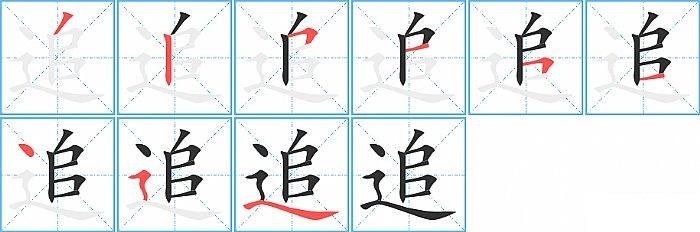 追是半包围结构,追的部首是“辶”,部外笔画6画,总笔画9画,追的笔画顺序是“撇、竖、横折、横、横折、横、点、横折折撇、捺”。看看“追”字什么意思 >>