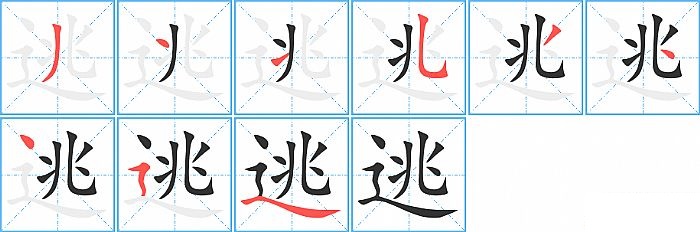 逃是半包围结构,逃的部首是“辶”,部外笔画6画,总笔画9画,逃的笔画顺序是“撇、点、提、竖弯钩、撇、点、点、横折折撇、捺”。看看“逃”字什么意思 >>