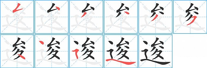 逡是半包围结构,逡的部首是“辶”,部外笔画7画,总笔画10画,逡的笔画顺序是“撇折、点、撇、点、撇、横撇/横钩、点、点、横折折撇、捺”。看看“逡”字什么意思 >>