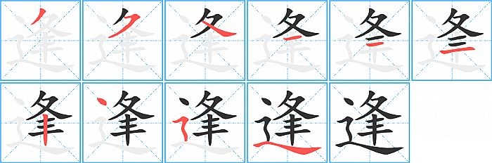 逢是半包围结构,逢的部首是“辶”,部外笔画7画,总笔画10画,逢的笔画顺序是“撇、横撇/横钩、捺、横、横、横、竖、点、横折折撇、捺”。看看“逢”字什么意思 >>