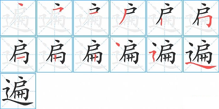遍是半包围结构,遍的部首是“辶”,部外笔画9画,总笔画12画,遍的笔画顺序是“点、横折、横、撇、竖、横折钩、横、竖、竖、点、横折折撇、捺”。看看“遍”字什么意思 >>