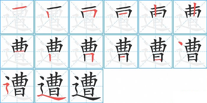 遭是半包围结构,遭的部首是“辶”,部外笔画11画,总笔画14画,遭的笔画顺序是“横、竖、横折、横、竖、竖、横、竖、横折、横、横、点、横折折撇、捺”。看看“遭”字什么意思 >>