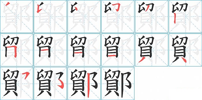 鄮是左右结构,鄮的部首是“阝”,部外笔画12画,总笔画14画,鄮的笔画顺序是“撇、竖提、点、横折钩、撇、竖、横折、横、横、横、撇、点、横折折折钩/横撇弯钩、竖”。看看“鄮”字什么意思 >>