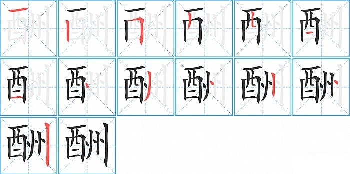 酬是左右结构,酬的部首是“酉”,部外笔画6画,总笔画13画,酬的笔画顺序是“横、竖、横折、撇、竖折/竖弯、横、横、点、撇、点、竖、点、竖”。看看“酬”字什么意思 >>