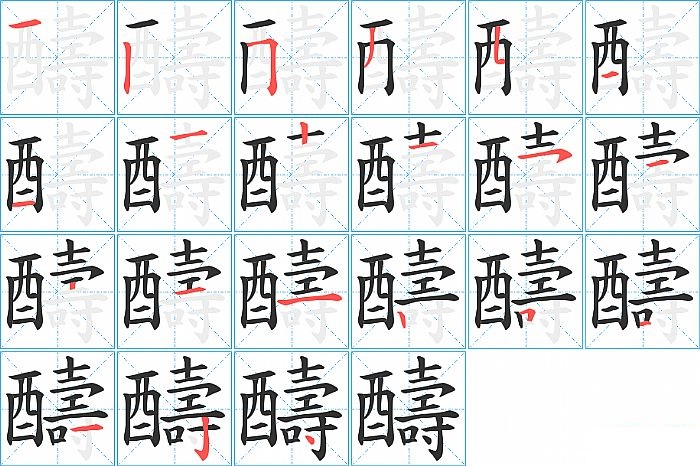 醻是左右结构,醻的部首是“酉”,部外笔画14画,总笔画21画,醻的笔画顺序是“横、竖、横折、撇、竖折/竖弯、横、横、横、竖、横、横撇/横钩、横、竖、横、横、竖、横折、横、横、竖钩、点”。看看“醻”字什么意思 >>