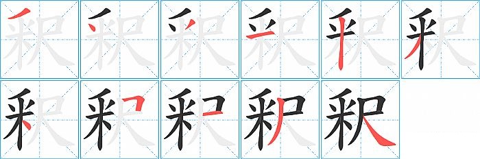釈是左右结构,釈的部首是“采”,部外笔画4画,总笔画11画,釈的笔画顺序是“撇、点、撇、横、竖、撇、点、横折、横、撇、捺”。看看“釈”字什么意思 >>