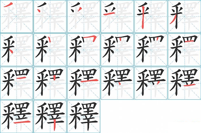 釋是左右结构,釋的部首是“采”,部外笔画13画,总笔画20画,釋的笔画顺序是“撇、点、撇、横、竖、撇、点、竖、横折、竖、竖、横、横、竖、横、点、撇、横、横、竖”。看看“釋”字什么意思 >>