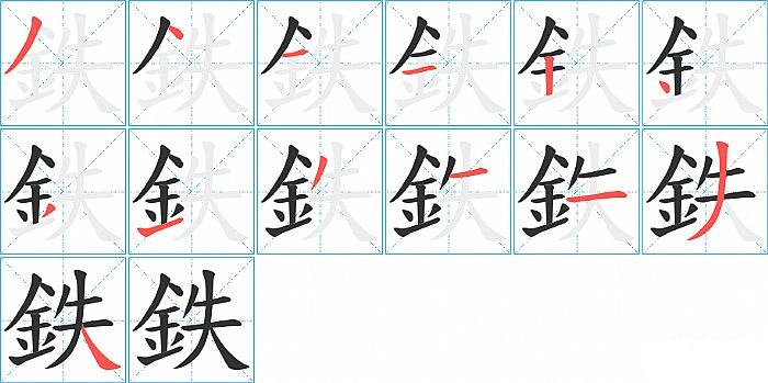 鉄是左右结构,鉄的部首是“釒”,部外笔画5画,总笔画13画,鉄的笔画顺序是“撇、点、横、横、竖、点、撇、提、撇、横、横、撇、捺”。看看“鉄”字什么意思 >>