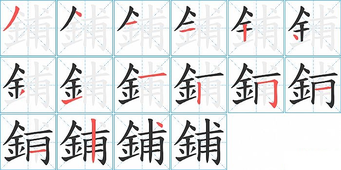 鋪是左右结构,鋪的部首是“釒”,部外笔画7画,总笔画15画,鋪的笔画顺序是“撇、点、横、横、竖、点、撇、提、横、竖、横折钩、横、横、竖、点”。看看“鋪”字什么意思 >>
