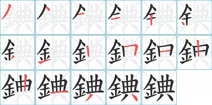 錪是左右结构,錪的部首是“釒”,部外笔画8画,总笔画16画,錪的笔画顺序是“撇、点、横、横、竖、点、撇、提、竖、横折、横、竖、竖、横、撇、点”。看看“錪”字什么意思 >>