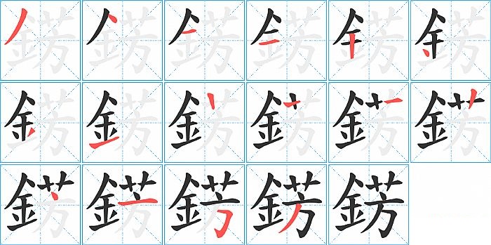 錺是左右结构,錺的部首是“釒”,部外笔画7画,总笔画15画,錺的笔画顺序是“撇、点、横、横、竖、点、撇、提、横、竖、竖、点、横、横折钩、撇”。看看“錺”字什么意思 >>