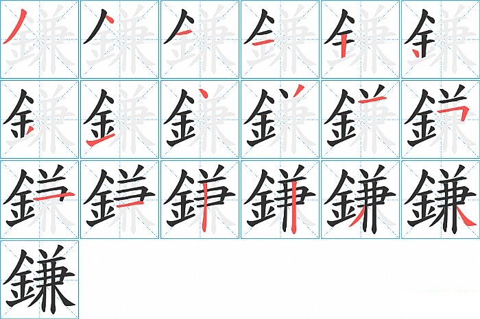 鎌是左右结构,鎌的部首是“釒”,部外笔画10画,总笔画18画,鎌的笔画顺序是“撇、点、横、横、竖、点、撇、提、点、撇、横、横折、横、横、竖、竖、撇、捺”。看看“鎌”字什么意思 >>