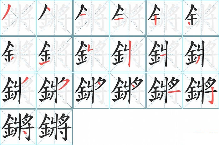 鏘是左右结构,鏘的部首是“釒”,部外笔画11画,总笔画19画,鏘的笔画顺序是“撇、点、横、横、竖、点、撇、提、竖折/竖弯、竖、横、撇、撇、横撇/横钩、点、点、横、竖钩、点”。看看“鏘”字什么意思 >>