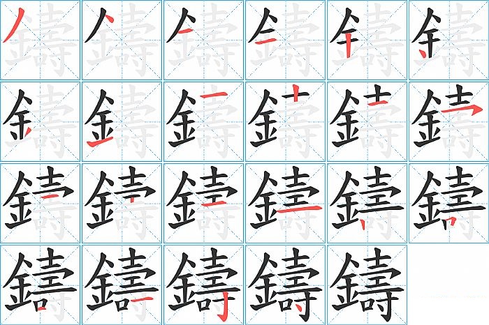 鑄是左右结构,鑄的部首是“釒”,部外笔画14画,总笔画22画,鑄的笔画顺序是“撇、点、横、横、竖、点、撇、提、横、竖、横、横撇/横钩、横、竖、横、横、竖、横折、横、横、竖钩、点”。看看“鑄”字什么意思 >>