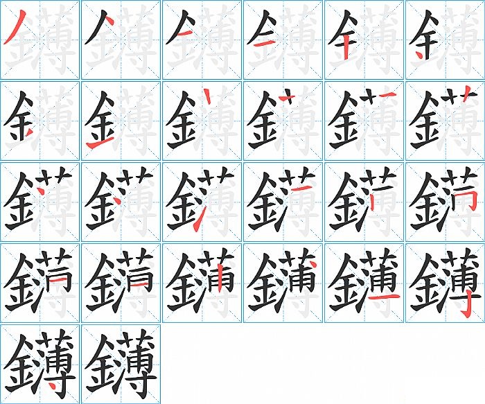 鑮是左右结构,鑮的部首是“釒”,部外笔画16画,总笔画24画,鑮的笔画顺序是“撇、点、横、横、竖、点、撇、提、横、竖、竖、点、点、提、横、竖、横折、横、横、竖、点、横、竖钩、点”。看看“鑮”字什么意思 >>