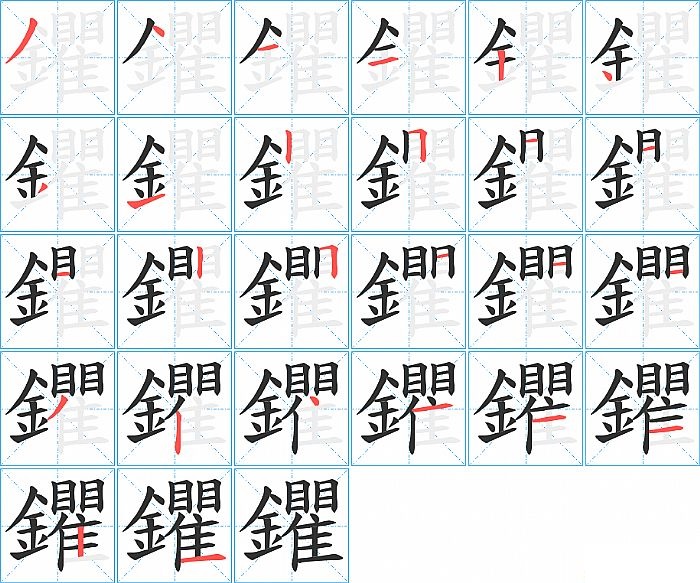 鑺是左右结构,鑺的部首是“釒”,部外笔画18画,总笔画26画,鑺的笔画顺序是“撇、点、横、横、竖、点、撇、提、竖、横折、横、横、横、竖、横折、横、横、横、撇、竖、点、横、横、横、竖、横”。看看“鑺”字什么意思 >>