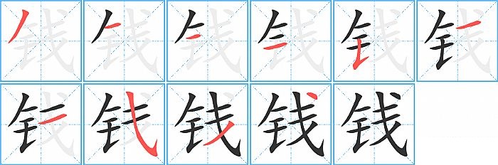 《钱》字的笔顺分步演示图(一笔一画写汉字)