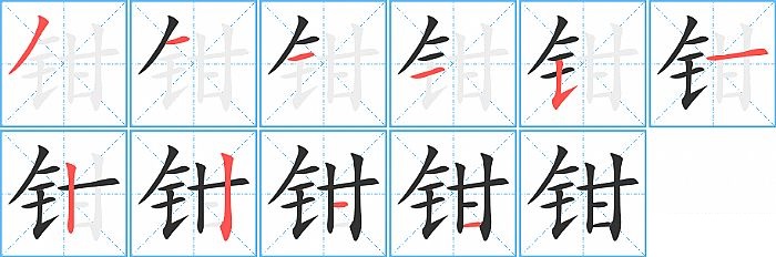《钳》字的笔顺分步演示图(一笔一画写汉字)