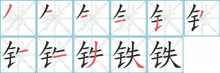《铁》字的笔顺分步演示图(一笔一画写汉字)