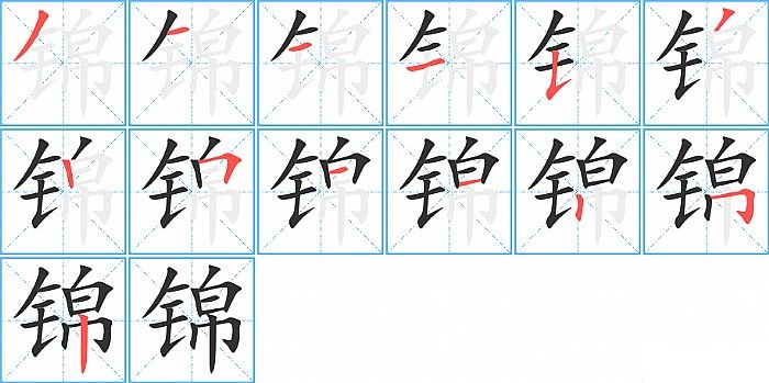锦是左右结构,锦的部首是“钅”,部外笔画8画,总笔画13画,锦的笔画顺序是“撇、横、横、横、竖提、撇、竖、横折、横、横、竖、横折钩、竖”。看看“锦”字什么意思 >>