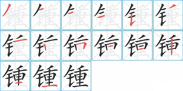 锺是左右结构,锺的部首是“钅”,部外笔画9画,总笔画14画,锺的笔画顺序是“撇、横、横、横、竖提、撇、横、竖、横折、横、横、横、竖、横”。看看“锺”字什么意思 >>