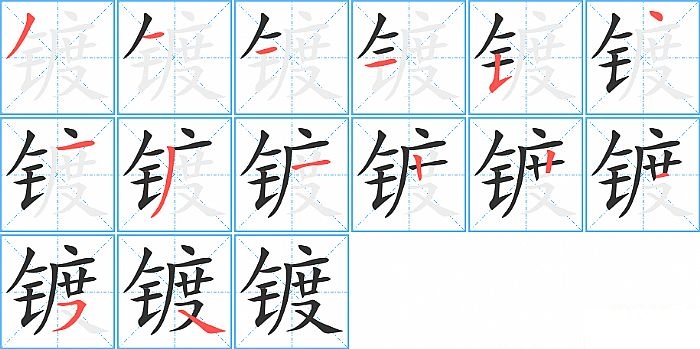 镀是左右结构,镀的部首是“钅”,部外笔画9画,总笔画14画,镀的笔画顺序是“撇、横、横、横、竖提、点、横、撇、横、竖、竖、横、横撇/横钩、捺”。看看“镀”字什么意思 >>