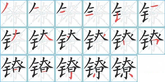 镣是左右结构,镣的部首是“钅”,部外笔画12画,总笔画17画,镣的笔画顺序是“撇、横、横、横、竖提、横、撇、捺、点、撇、竖、横折、横、横、竖钩、撇、点”。看看“镣”字什么意思 >>