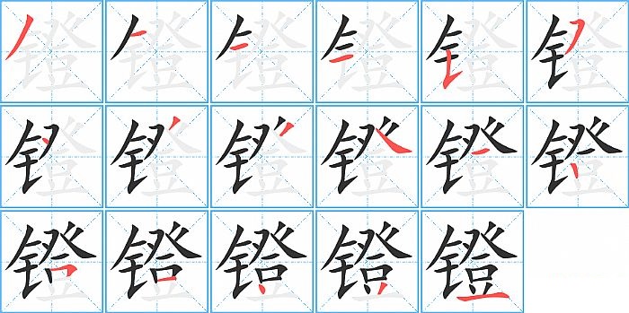 镫是左右结构,镫的部首是“钅”,部外笔画12画,总笔画17画,镫的笔画顺序是“撇、横、横、横、竖提、横撇/横钩、点、撇、撇、捺、横、竖、横折、横、点、撇、横”。看看“镫”字什么意思 >>