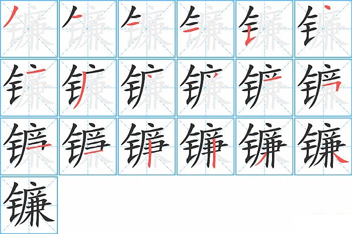 镰是左右结构,镰的部首是“钅”,部外笔画13画,总笔画18画,镰的笔画顺序是“撇、横、横、横、竖提、点、横、撇、点、撇、横、横折、横、横、竖、竖、撇、捺”。看看“镰”字什么意思 >>