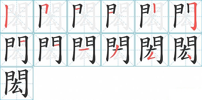 閎是上包围结构,閎的部首是“門”,部外笔画4画,总笔画12画,閎的笔画顺序是“横折、横、横、竖、竖、横折钩、横、横、横、撇、撇折、点”。看看“閎”字什么意思 >>