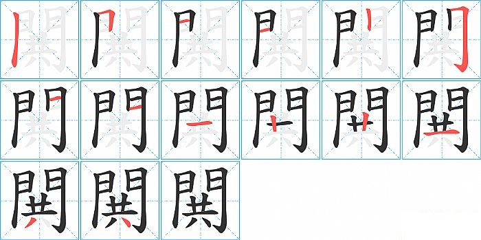 閧是上包围结构,閧的部首是“門”,部外笔画6画,总笔画14画,閧的笔画顺序是“横折、横、横、竖、竖、横折钩、横、横、横、竖、竖、横、撇、点”。看看“閧”字什么意思 >>