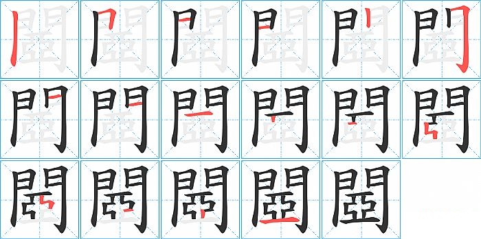 閸是上包围结构,閸的部首是“門”,部外笔画8画,总笔画16画,閸的笔画顺序是“横折、横、横、竖、竖、横折钩、横、横、横、竖、横、竖折撇/竖折折、竖折撇/竖折折、横、竖、横”。看看“閸”字什么意思 >>