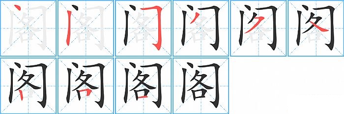 阁是半包围结构,阁的部首是“门”,部外笔画6画,总笔画9画,阁的笔画顺序是“点、竖、横折钩、撇、横撇/横钩、捺、竖、横折、横”。看看“阁”字什么意思 >>