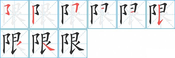 限是左右结构,限的部首是“阝”,部外笔画6画,总笔画8画,限的笔画顺序是“横折折折钩/横撇弯钩、竖、横折、横、横、竖提、撇、捺”。看看“限”字什么意思 >>