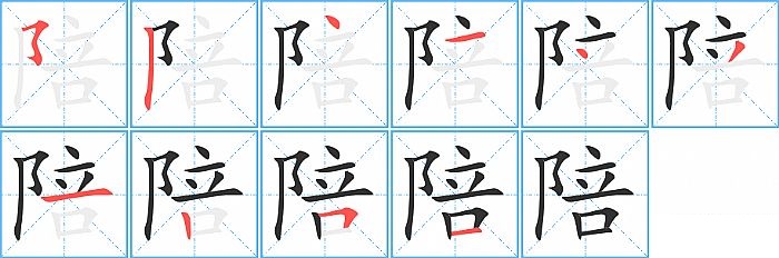 陪是左右结构,陪的部首是“阝”,部外笔画8画,总笔画10画,陪的笔画顺序是“横折折折钩/横撇弯钩、竖、点、横、点、撇、横、竖、横折、横”。看看“陪”字什么意思 >>