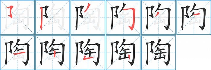陶是左右结构,陶的部首是“阝”,部外笔画8画,总笔画10画,陶的笔画顺序是“横折折折钩/横撇弯钩、竖、撇、横折钩、撇、横、横、竖、竖折/竖弯、竖”。看看“陶”字什么意思 >>