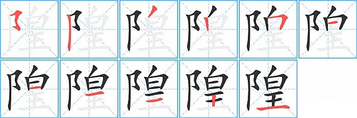 隍是左右结构,隍的部首是“阝”,部外笔画9画,总笔画11画,隍的笔画顺序是“横折折折钩/横撇弯钩、竖、撇、竖、横折、横、横、横、横、竖、横”。看看“隍”字什么意思 >>