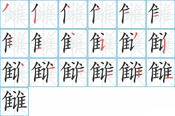雠是左中右结构,雠的部首是“隹”,部外笔画10画,总笔画18画,雠的笔画顺序是“撇、竖、点、横、横、横、竖、横、点、横折提、撇、竖、点、横、横、横、竖、横”。看看“雠”字什么意思 >>