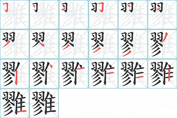 雡是左右结构,雡的部首是“隹”,部外笔画11画,总笔画19画,雡的笔画顺序是“横折、点、提、横折、点、提、撇、点、撇、撇、撇、撇、竖、点、横、横、横、竖、横”。看看“雡”字什么意思 >>