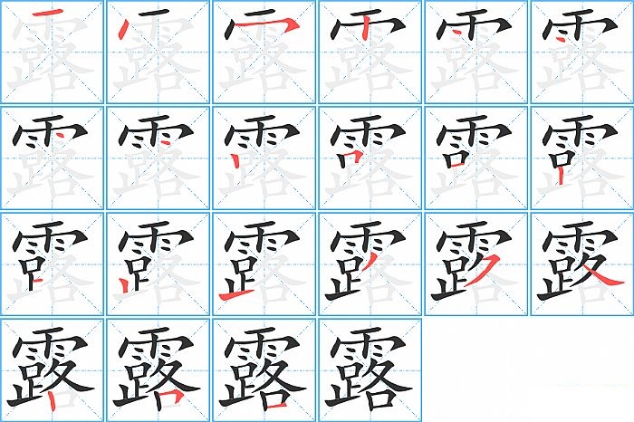 露是上下结构,露的部首是“雨”,部外笔画13画,总笔画21画,露的笔画顺序是“横、点、横撇/横钩、竖、点、点、点、点、竖、横折、横、竖、横、竖、提、撇、横撇/横钩、捺、竖、横折、横”。看看“露”字什么意思 >>