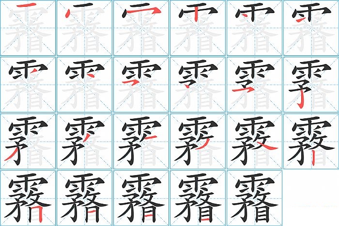 霿是上下结构,霿的部首是“雨”,部外笔画13画,总笔画21画,霿的笔画顺序是“横、点、横撇/横钩、竖、点、点、点、点、横撇/横钩、点、横撇/横钩、竖钩、撇、撇、横撇/横钩、捺、竖、横折、横、横、横”。看看“霿”字什么意思 >>