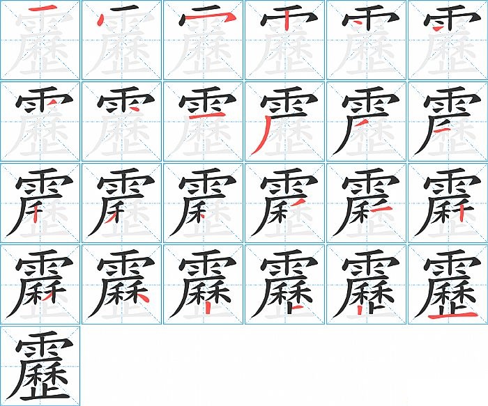 靂是上下结构,靂的部首是“雨”,部外笔画16画,总笔画24画,靂的笔画顺序是“横、点、横撇/横钩、竖、点、点、点、点、横、撇、撇、横、竖、撇、点、撇、横、竖、撇、捺、竖、横、竖、横”。看看“靂”字什么意思 >>