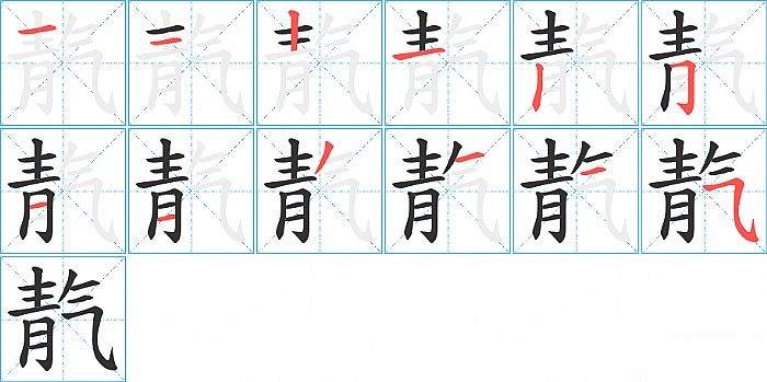 靔是左右结构,靔的部首是“青”,部外笔画4画,总笔画12画,靔的笔画顺序是“横、横、竖、横、竖、横折钩、横、横、撇、横、横、横折弯钩/横斜钩”。看看“靔”字什么意思 >>