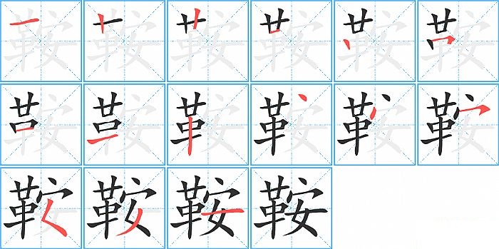 鞍是左右结构,鞍的部首是“革”,部外笔画6画,总笔画15画,鞍的笔画顺序是“横、竖、竖、横、竖、横折、横、横、竖、点、点、横撇/横钩、撇点、撇、横”。看看“鞍”字什么意思 >>