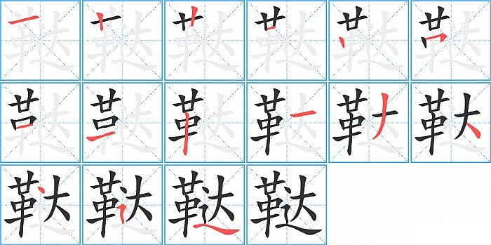 鞑是左右结构,鞑的部首是“革”,部外笔画6画,总笔画15画,鞑的笔画顺序是“横、竖、竖、横、竖、横折、横、横、竖、横、撇、点、点、横折折撇、捺”。看看“鞑”字什么意思 >>