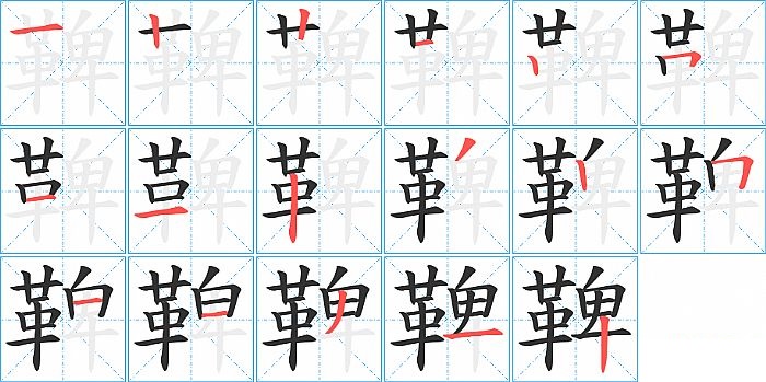 鞞是左右结构,鞞的部首是“革”,部外笔画8画,总笔画17画,鞞的笔画顺序是“横、竖、竖、横、竖、横折、横、横、竖、撇、竖、横折、横、横、撇、横、竖”。看看“鞞”字什么意思 >>