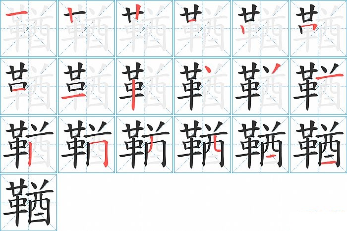 鞧是左右结构,鞧的部首是“革”,部外笔画9画,总笔画18画,鞧的笔画顺序是“横、竖、竖、横、竖、横折、横、横、竖、点、撇、横、竖、横折、撇、竖折/竖弯、横、横”。看看“鞧”字什么意思 >>
